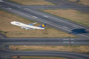 An aerial view of a Lufthansa 747 casting a shadow on a runway shortly after takeoff in Boston