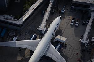 An aerial view of a Delta A330 being loaded up before a flight in Boston