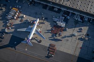 An aerial view of a Federal Express Boeing 767 being loaded up in Boston