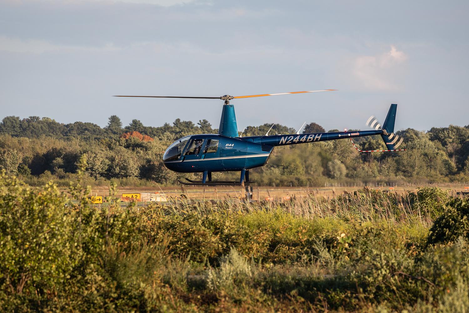 A Robinson R44 helicopter flying shortly after taking off