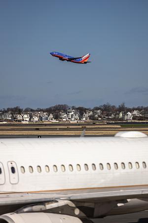 A Southwest Airlines jet taking off from Boston's Logan Airport