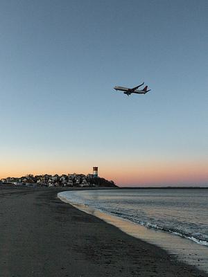 A Delta Airlines plane flying over a beach at sunset prior to landing in Boston