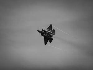 An Air Force F-35 shows its belly as it fly's by in monochrome