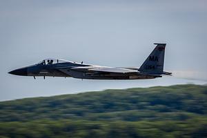A Massachusetts Air National Guard F-15 performing a low level high speed pass during a demonstration at an air show at its home airfield in Westfield