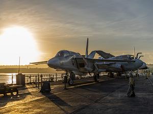 Fighter jets on the USS Midway in San Diego at sunset