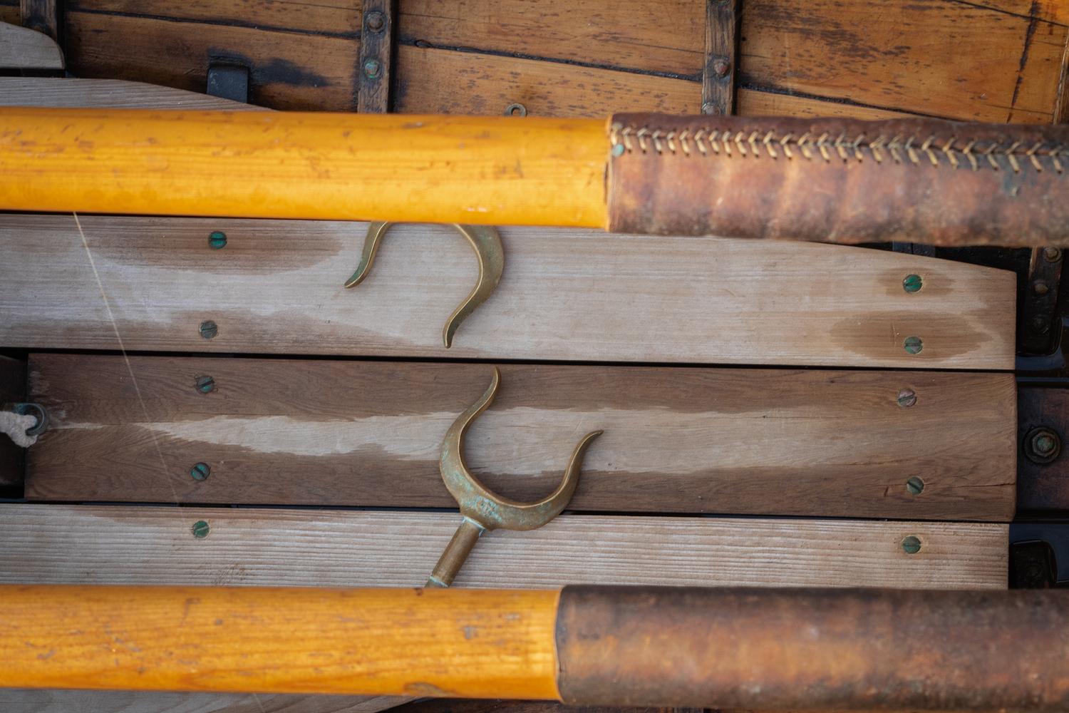 An old set of oar locks between oars on a wooden row boat