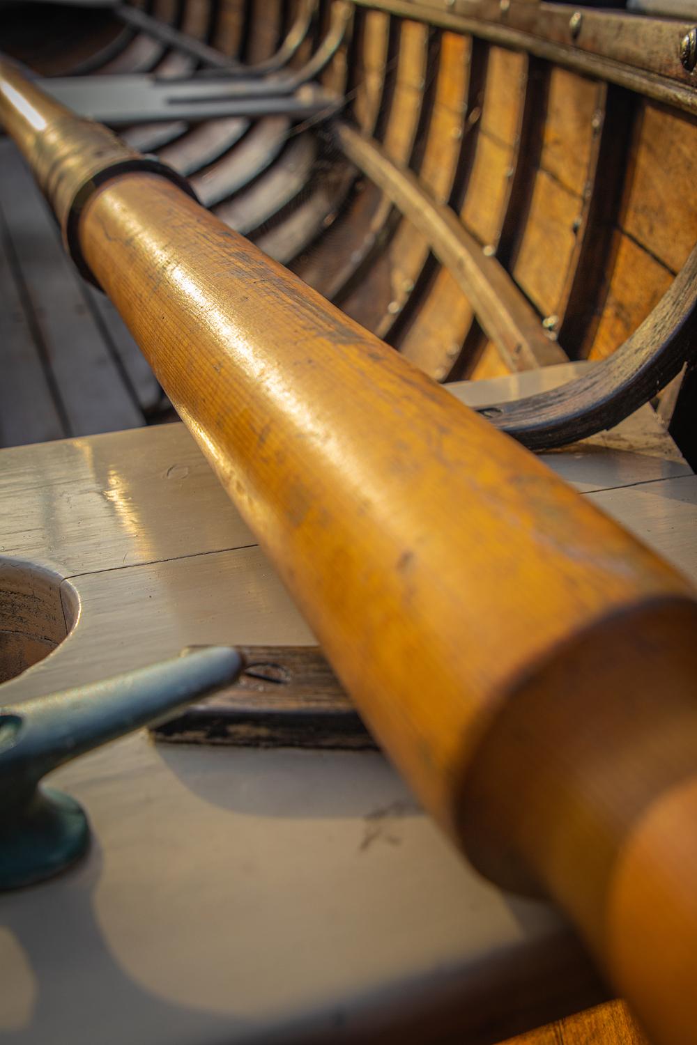 A oar sits on seat of a old wooden row boat