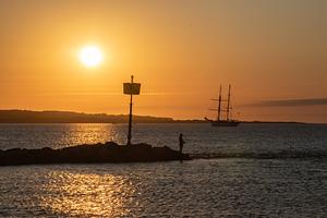 A old sailing schooner at sunset off the coast of Martha's Vineyard as someone fishes of a rock jetty