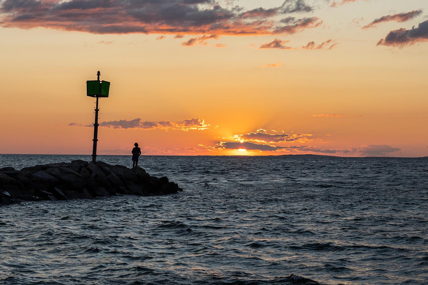 A solo fisherman stands at the end of a rock jetty fishing at sunset
