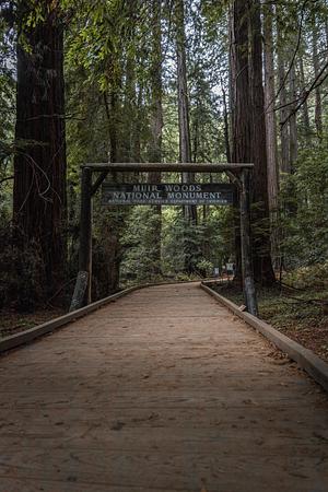 A wooden pathway and sign at the entrance to the Muir Woods in Northern California