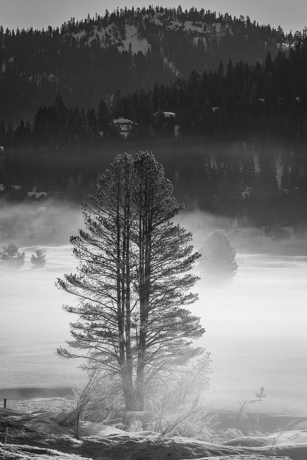 A tree stands in the mist before a snow covered field near Lake Tahoe California