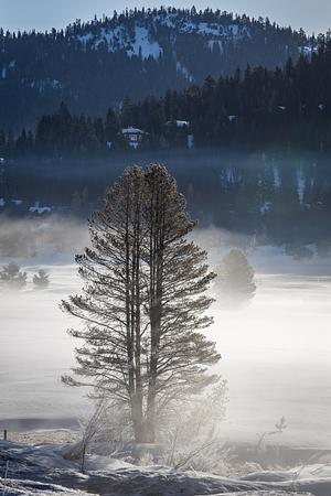 A tree stands in the mist with a snow covered field behind it near Lake Tahoe California