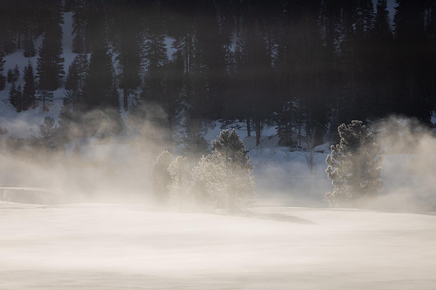 Frosty trees across a snow covered field in the mist near Lake Tahoe California
