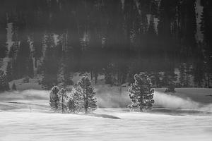 Trees standing in a snow covered field in the Olympic Valley near Lake Tahoe California