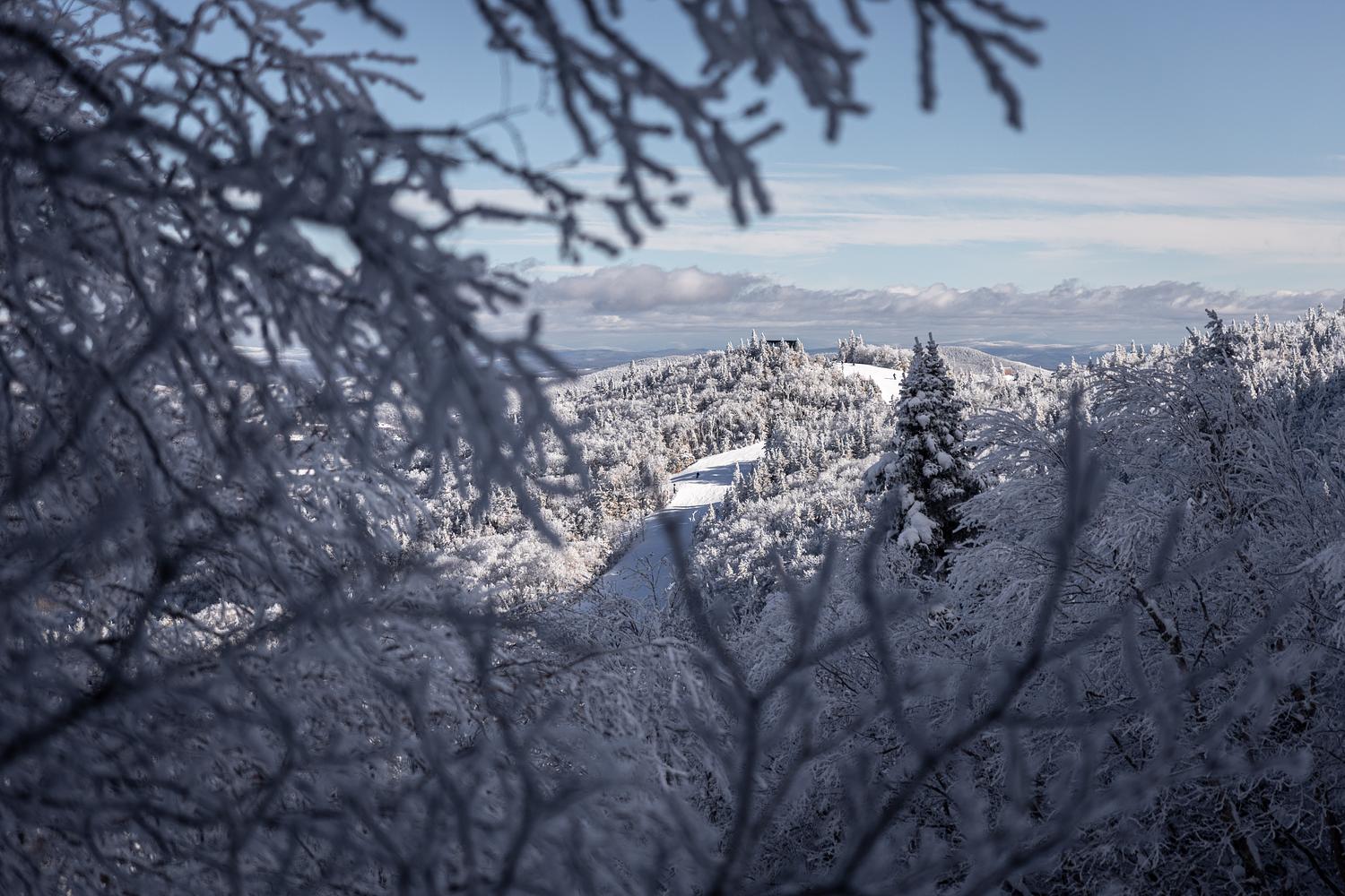 A snowy mountain at a ski resort pokes through the trees in Vermont