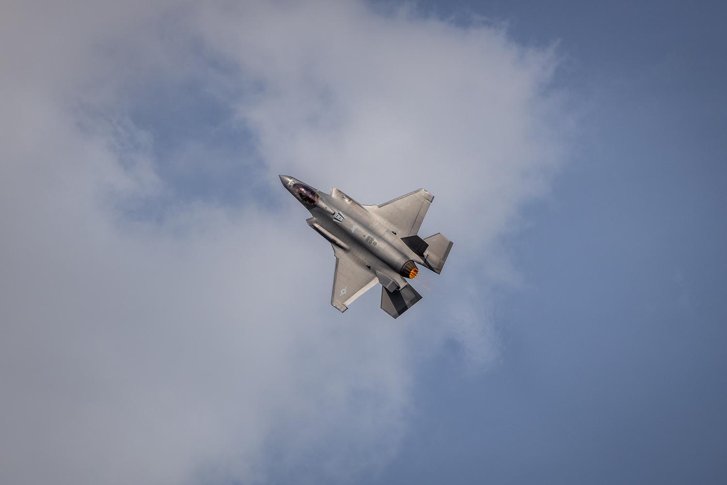 An United States Air Force F-35 fighter jet performing at an airshow with afterburner
