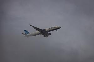 A JetBlue Airways A321 pops through the clouds before landing in Boston after a flight from San Francisco