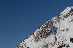 The moon rises over a rugged snow covered ridge in the mountains of Utah
