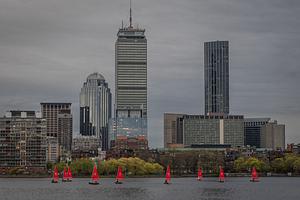 A group of small sailboats sailing together on the Charles River with the Boston skyline behind them