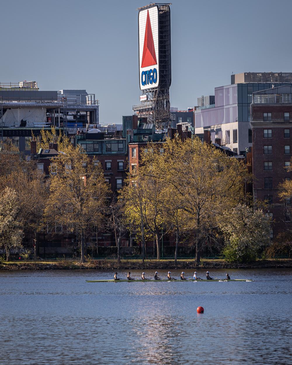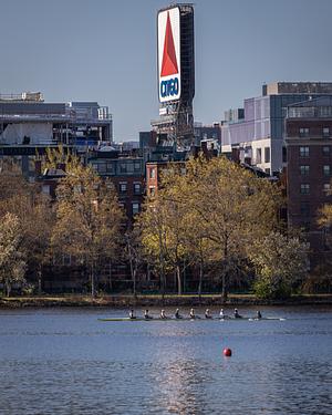 Rowers on the Charles River in Boston with the Citgo sign in the background
