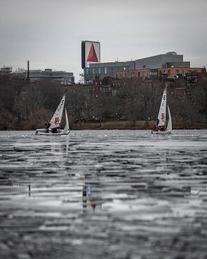 A group of small sailboats sailing together on the partially frozen Charles River with the Boston skyline behind them