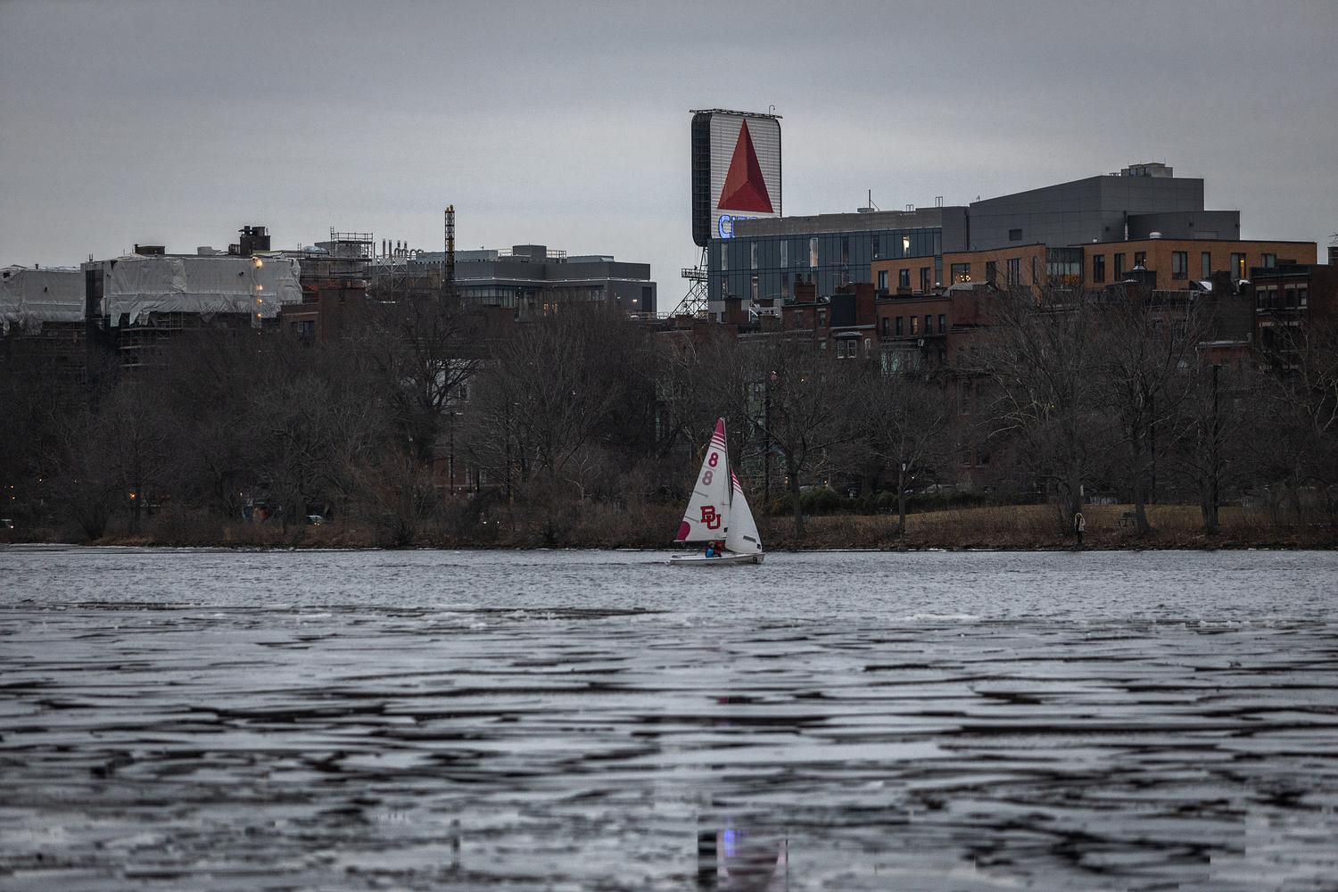 A small sailboat sailing solo on a wintery Charles River