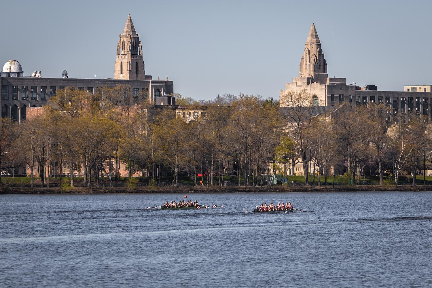 A pair of 8 person row boats on the Charles River with Boston University in the background