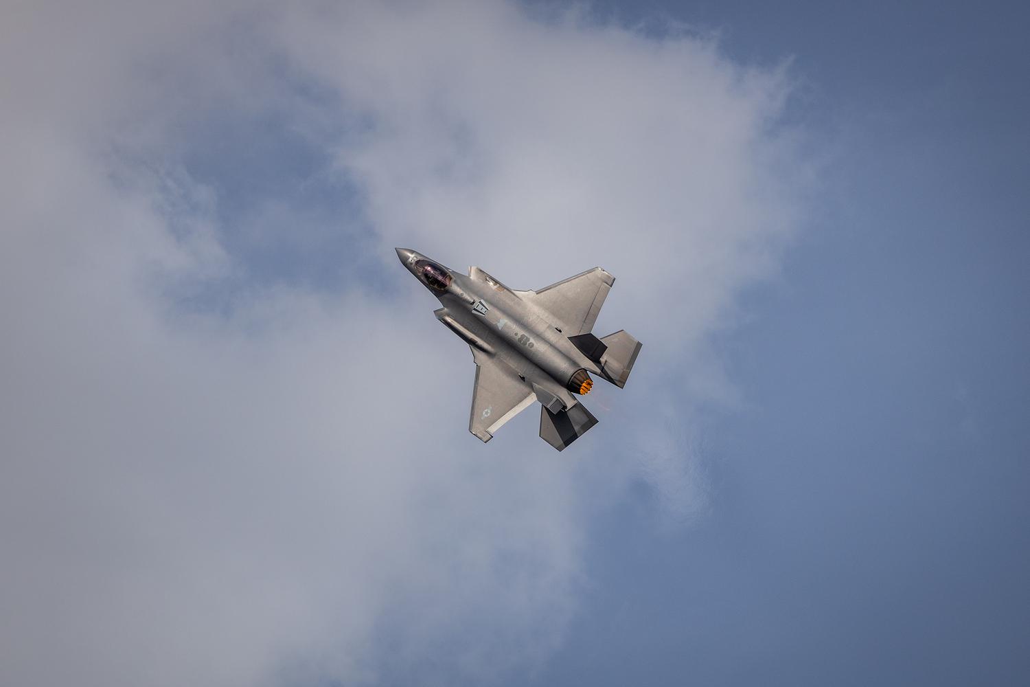A United States Air Force F-35 Lightning climbing passed some clouds