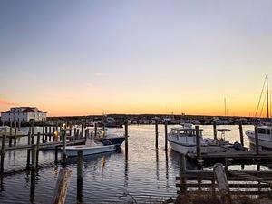 Boats in Menemsha Harbor on Marthas Vineyard at sunset