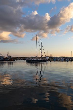 Boats in Menemsha Harbor sit calmly at sunset next to the watchful and always ready Coast Guard boats