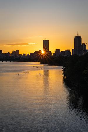 Rowers on the Charles River enjoy the dawn of a new day the sun greets Boston
