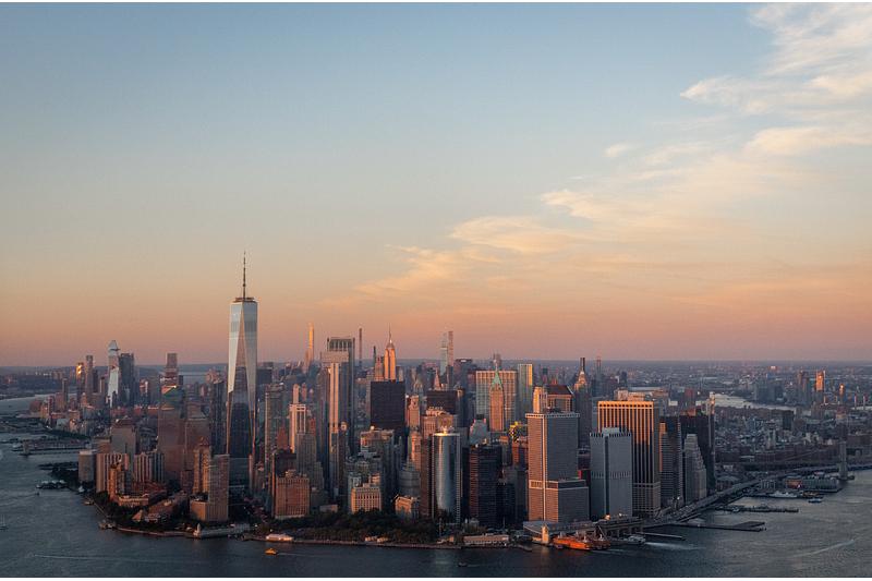The skyline of lower Manhattan basks in the glow of a late summer sunset